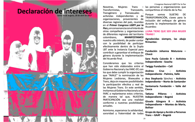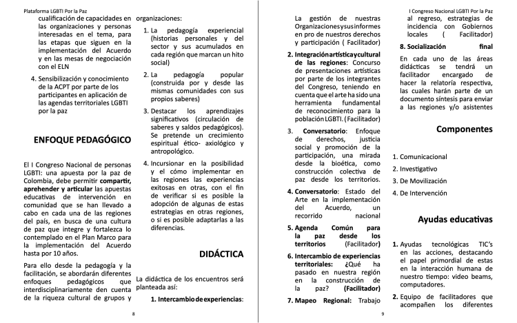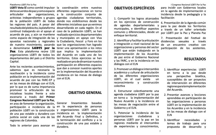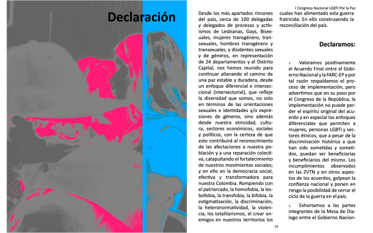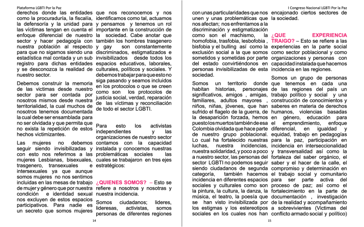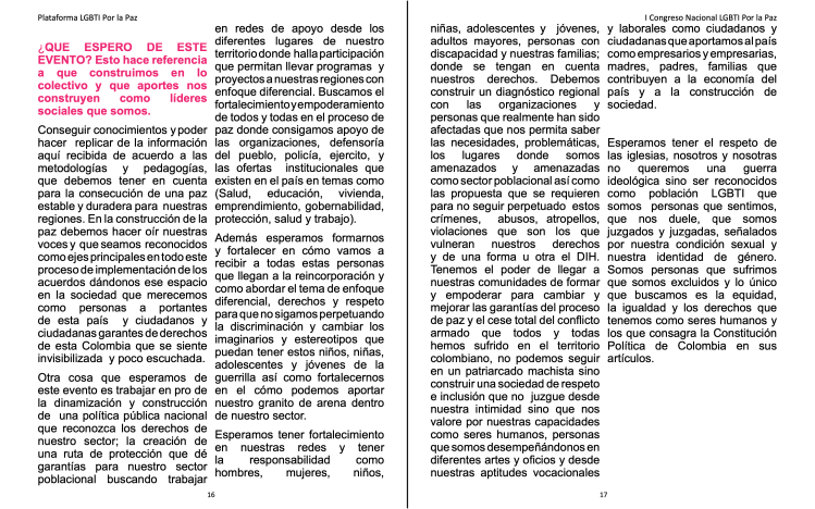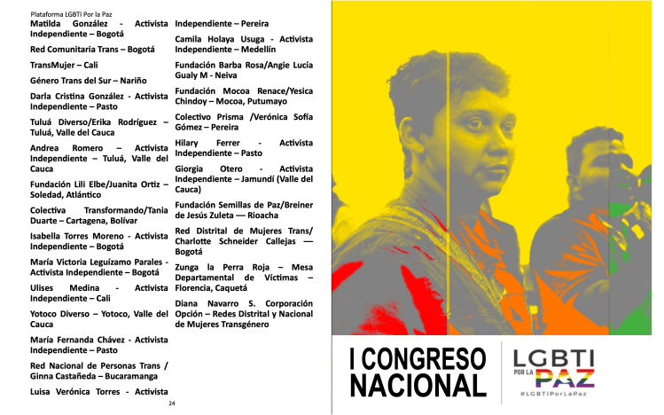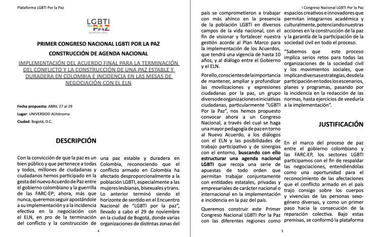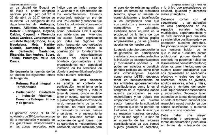 En el primer congreso se reunieron desde los más apartados rincones del país, cerca de 100 delegadas y delegados de procesos y activismos de los sectores LGBTI así como representación de los disidentes sexuales y de géneros, con el propósito de continuar allanando el camino de una paz estable y duradera que noa atañe a todos y que es de todos y para todos.